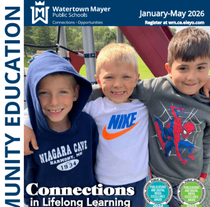 explorelIFELONG lEARNINGWinter 2026 Catalog** Registration Now Open** announcements & updates Winter/Spring 2026 Registration is Open!Most Community Education programs are now open for registration online. Catalogs will arrive in district mailboxes the week of December 8th, 2025. American Red Cross swimming lesson registration will open at 8am on Monday, December 15th. Swimming lesson dates and times can be found by clicking this link. Early Childhood Screening Early childhood screening is for children ages 3 1/2 and up to kindergarten entrance. Screening is provided at no cost to families and is held at the WM Community Learning Center.To make an appointment please use the screening sign up link below.For more information or questions about screening contact our Screening Coordinator, Kristy Phipps at 952-955-0280 or kristy.phipps@wm.k12.mn.us Screening Sign Up Early Childhood Family Education (ECFE) Young Royals Preschool Caring Hands Child Care6 wks - 48 mo. Kids' Company Out-of-School Time (OST) Child CarePreschool Age 4-5 yrsSchool Age Gr. K-6 Youth Programs KIPS Gymnastics Adult Programs Adult Getaways w/ Jolly Ramblers Aquatics Fitness Watertown-Mayer Community Learning Center 313 Angel Ave NW 952-955-0280 Door # 4 (Angel Ave) Community Ed Office, Youth Programs Door # 3 (Angel Ave) ECFE Evening ProgramsDoor # 2 (State Street) Limited Young Royals Preschool ClassesDoor # 1 (State Street) SAIL, Yoga, Community Access Community LoungeWM Comm. Learning Ctr. Available for RentalAccess Door # 1 (State Street) Free WalkingWM Comm. Learning Ctr.Mon & Wed 6-8pmSeptember - MayCall 952 955-0280 for availabilityAccess Door # 1 (State Street) Party PackagesGYM PACKAGE $100/2hrsPOOL PACKAGE $110/2hrs1LOUNGE PACKAGE $50/3 Hrs OR $100 6 Hrs.Contact Community Ed for more information and to reserve your party package952-955-0280 / wmcommunityed@wm.k12.mn.us Volunteer Application Photo Opt Out FormPlease complete the Photo Opt-Out form if you do not wish to have you or your child's picture published.